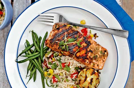 Serve the salmon with green beans and rice mixed with corn, chopped cherry tomatoes and coriander. Garnish with the grilled limes and a little extra thyme.